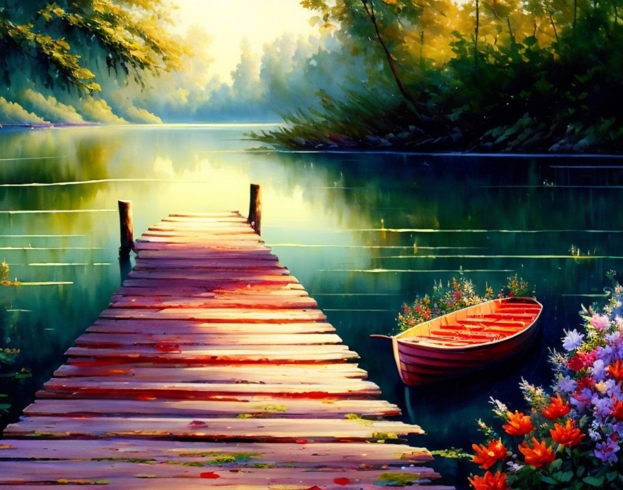 A wooden pier stretching into a calm lake with lilies, watercolor painting a sketch of landscape composed of flowers sprouting among freshly bloom, wildflowersrs, colors in shades of green, red, orange and yellow, elegant and highly detailed, Jean-Baptiste Monge, oil painting, bold strokes, paint drips, dripping paint, engine unreal, greg Rutkowski, alphonse Mucha, global illumination, intricate and detailed environment, Broken Glass effect, no background, stunning, something that even doesn't exist, mythical being, energy, molecular, textures, iridescent and luminescent scales, breathtaking beauty, pure perfection, divine presence, unforgettable, impressive, breathtaking beauty, Volumetric light, auras, rays, vivid colors reflects, storm clouds, sunset, boat