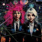 Two women stand confidently in a high-tech laboratory filled with intricate gadgets and glowing orbs. One has vibrant pink hair, while the other features sleek blonde locks, both in stylish attire.