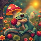 A whimsical lizard with large eyes sits in a colorful, enchanted forest, holding a raspberry. Vibrant flowers and a red mushroom add charm to the magical scene, illuminated by soft sunlight.