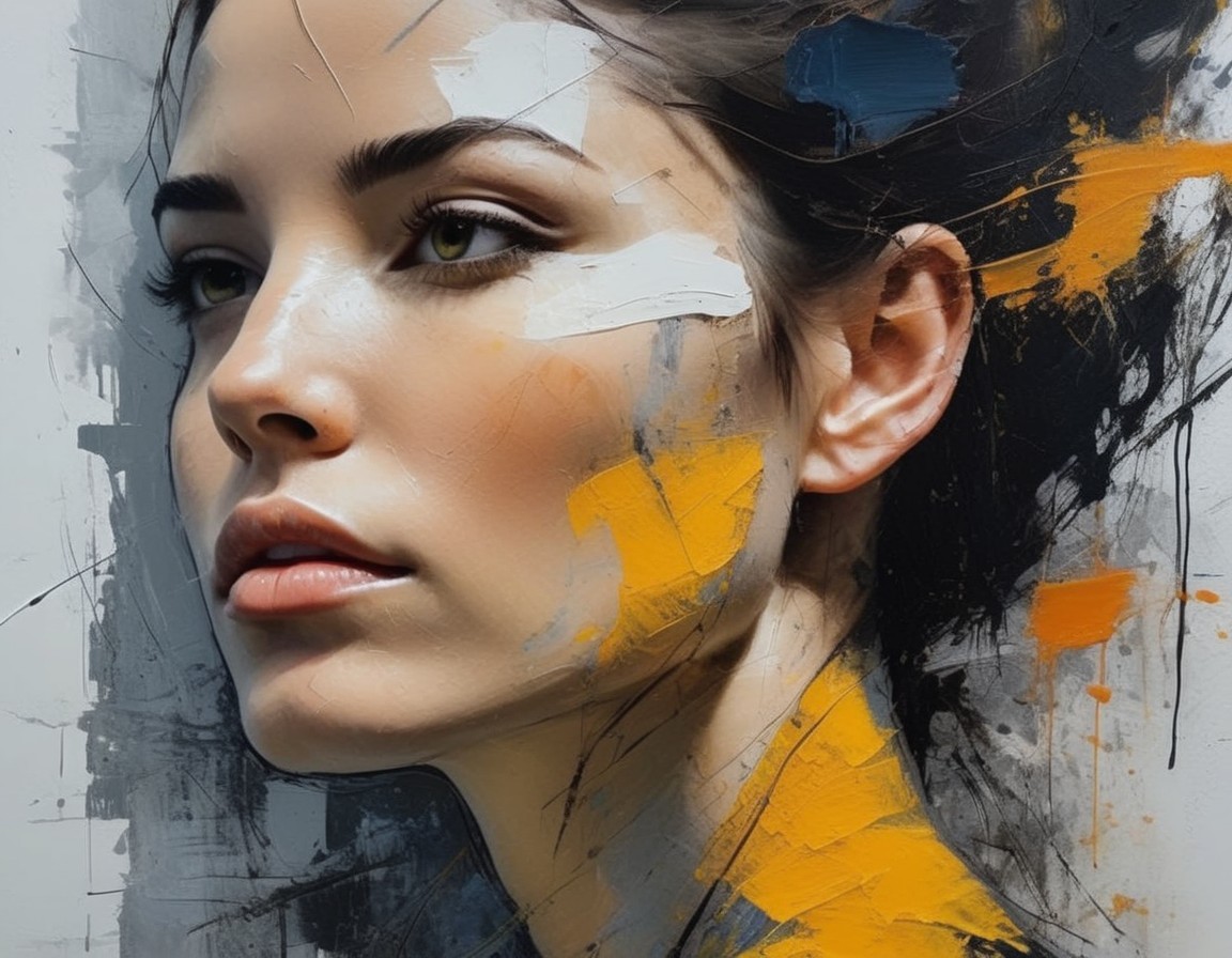 Prompt: Woman, perfect facial features, Minimalist, line art combined with loose sketching, visible brushstrokes, expressive brushstrokes, oil on canvas, abstract