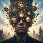 A surreal portrait of a man with glasses, his head adorned with intricate clocks and gears, set against a fantastical landscape featuring soaring towers and an expansive sky.