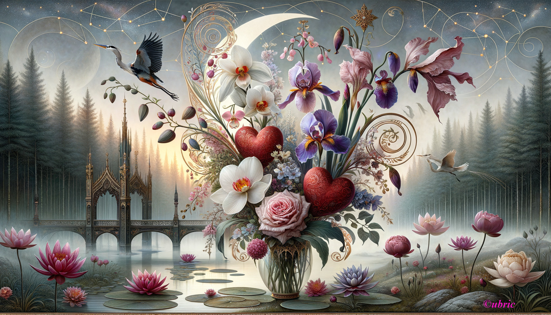 A fantasy artwork featuring vibrant flowers with a misty forest, bridge, and birds under a moonlit, starry sky.