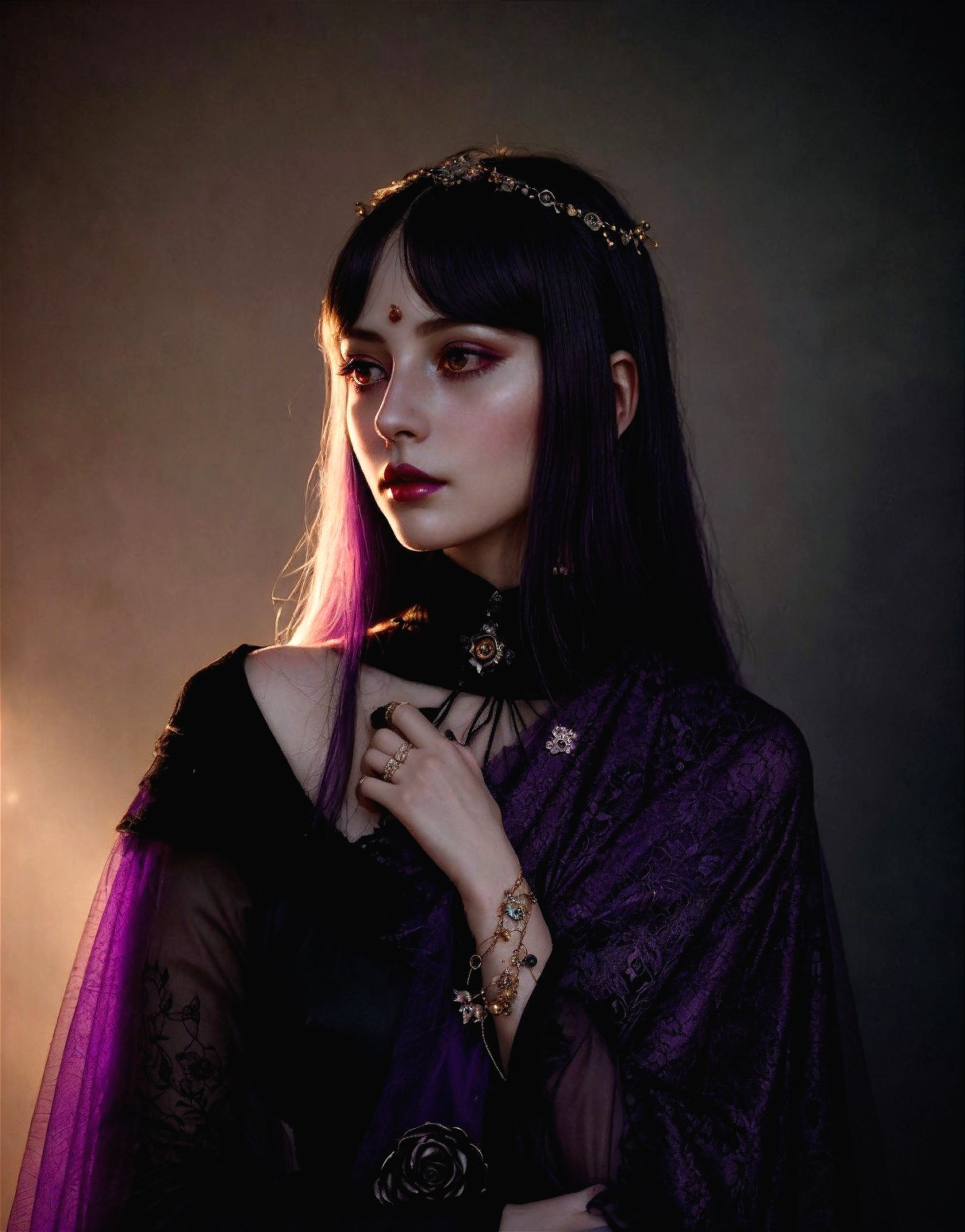 A mysterious figure with long, dark hair and a regal crown. Dressed in a flowing purple cloak, she gazes thoughtfully, adorned with intricate jewelry that adds to her enchanting presence.