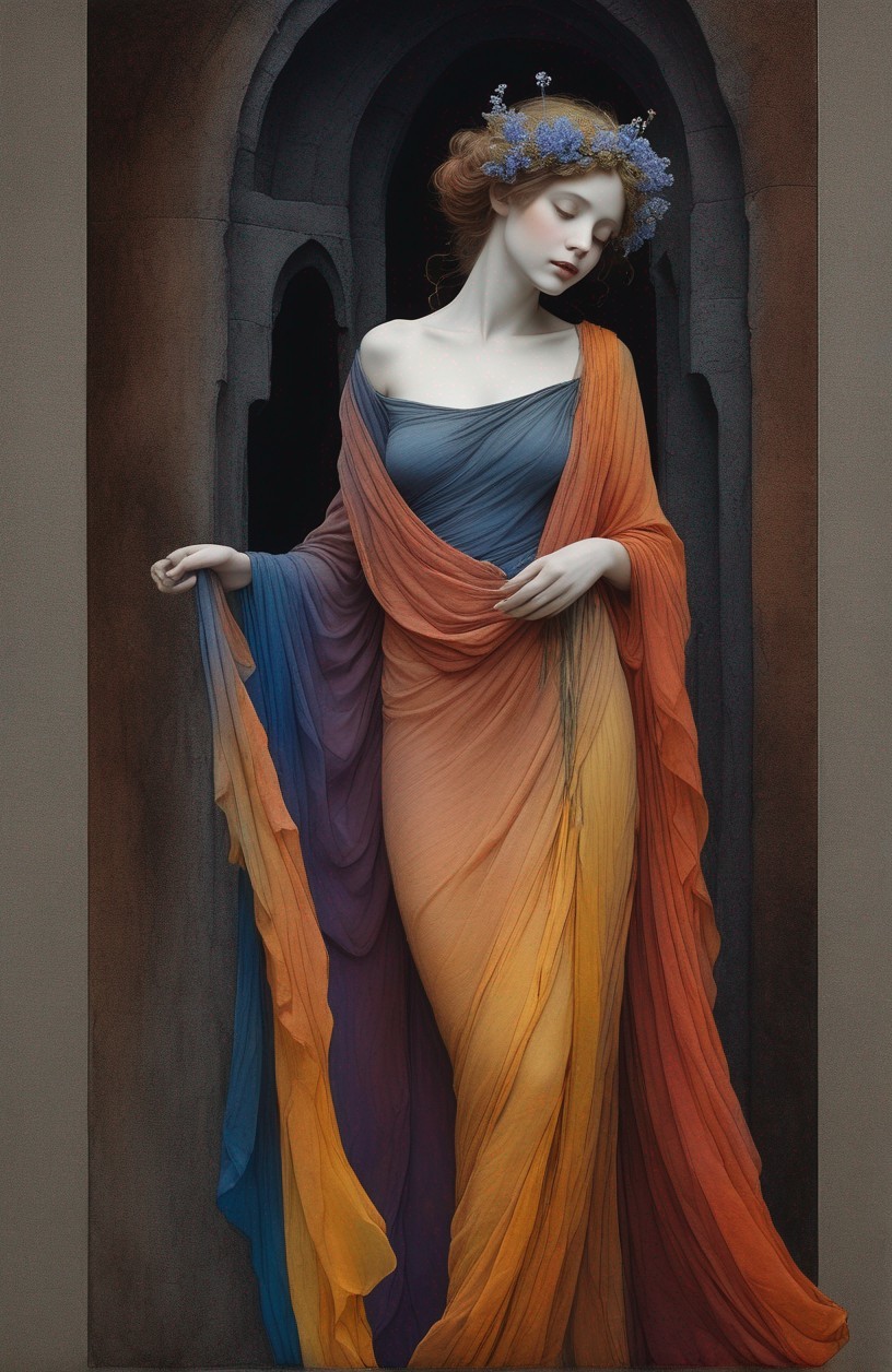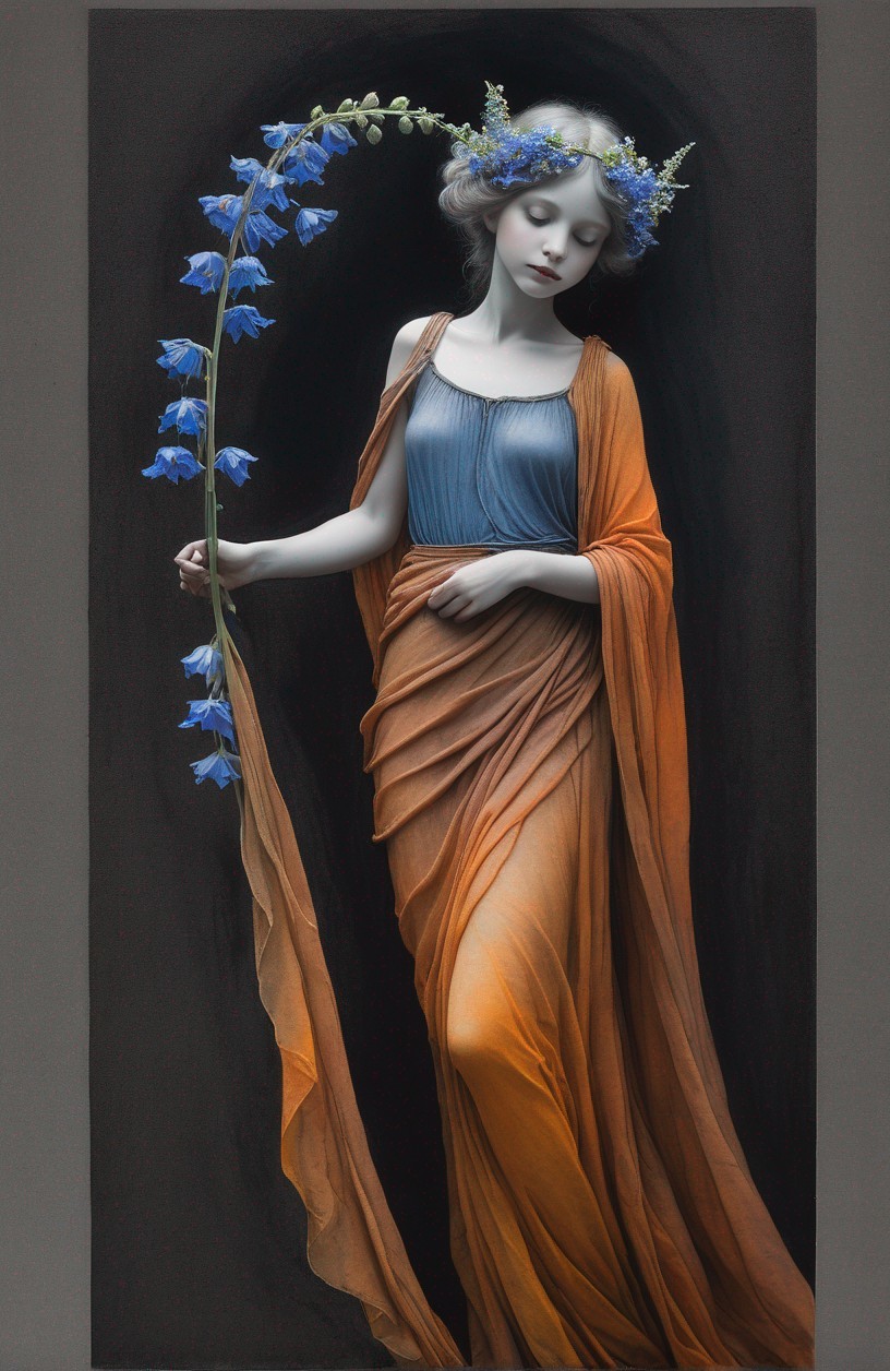 A striking portrait of a young girl with a floral wreath on her head, holding a bunch of flowers, depicted in gray tones with subtle color accents.