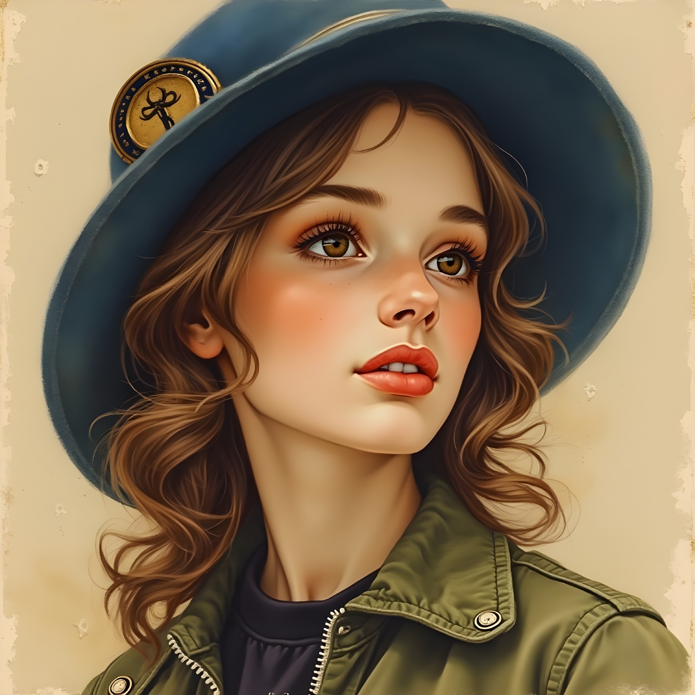 A young woman with wavy hair wears a stylish blue hat adorned with a pin, paired with a green jacket. Her expressive eyes and soft features convey a sense of warmth and curiosity.