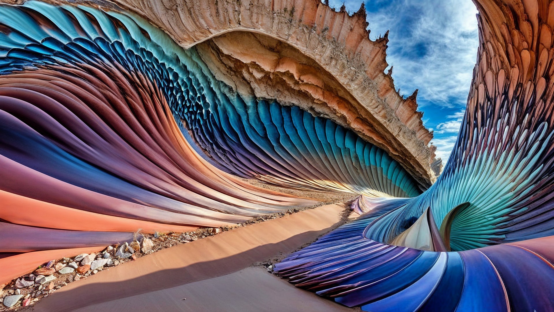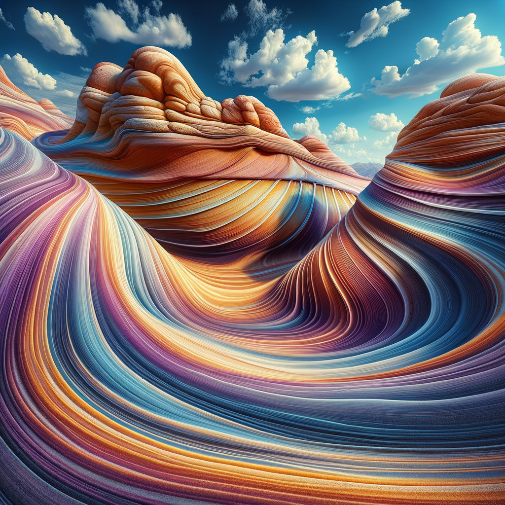 Vibrant, undulating hills of layered rock rise under a clear blue sky, showcasing a stunning array of reds, oranges, and purples, resembling waves in a desert landscape.