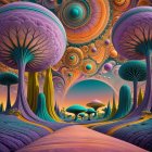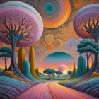 A surreal landscape features vibrant, whimsical trees under a swirling sky with a large celestial body. A winding path leads toward rolling hills and a colorful sunset, creating a dreamlike atmosphere.
