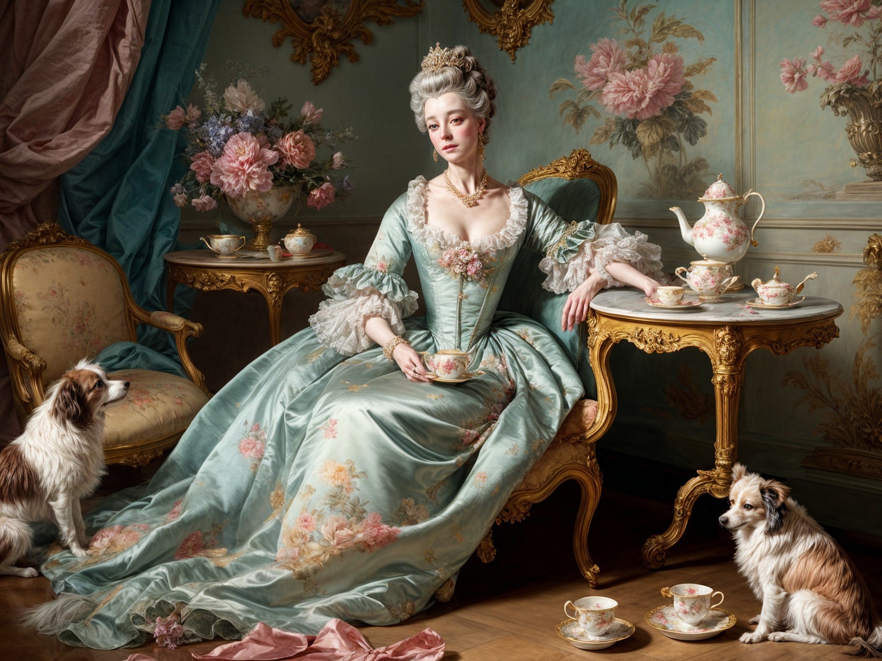 A woman in a luxurious pastel gown sits elegantly in a lavishly decorated room, surrounded by floral wallpaper and ornate furniture, accompanied by two dogs at her feet.