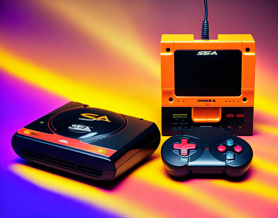 Vintage gaming consoles with controllers on colorful gradient backdrop