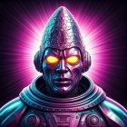 A stylized, futuristic figure with a metallic helmet and glowing orange eyes stands against a vibrant purple background, exuding a mysterious and otherworldly presence.