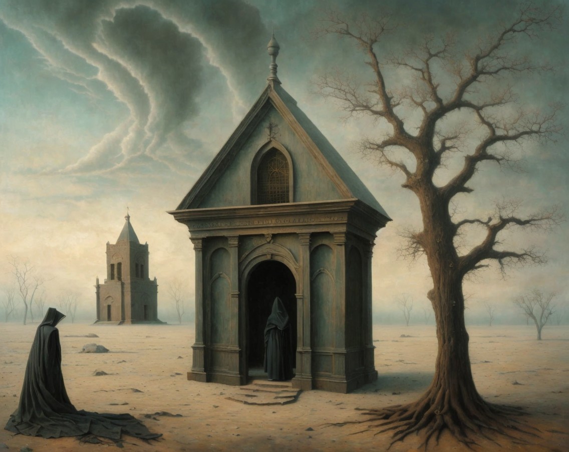 Barren Landscape with Mausoleum and Cloaked Figure