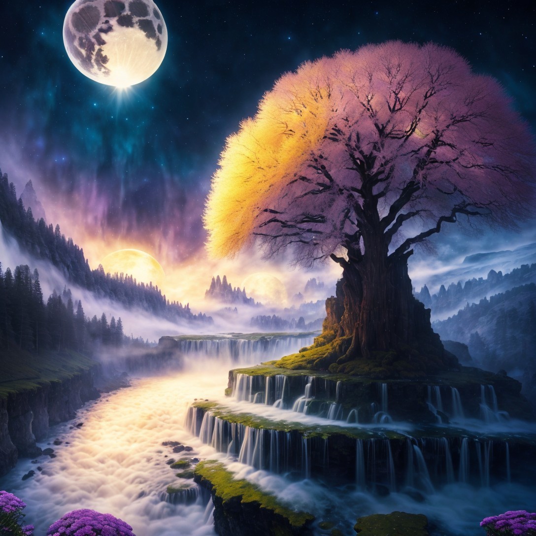Prompt: "landscape under cosmic sky, waterfalls, ice, giant trees, fullmoon, full moon, SURREALIST EYE-ORB DETAILS, flowers by Tomasz Alen Kopera, Dariusz Zawadzki, Gustav Klimt and Picasso."