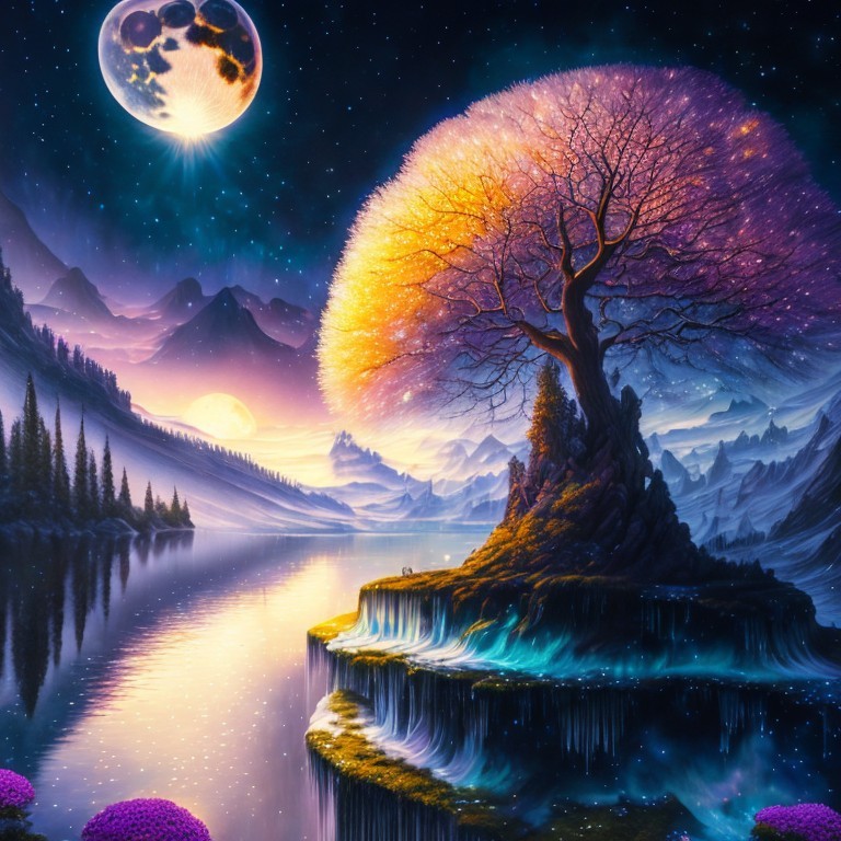 landscape under cosmic sky, waterfalls, ice, giant trees, fullmoon, full moon, SURREALIST EYE-ORB DETAILS, flowers by Tomasz Alen Kopera, Dariusz Zawadzki, Gustav Klimt and Picasso.
