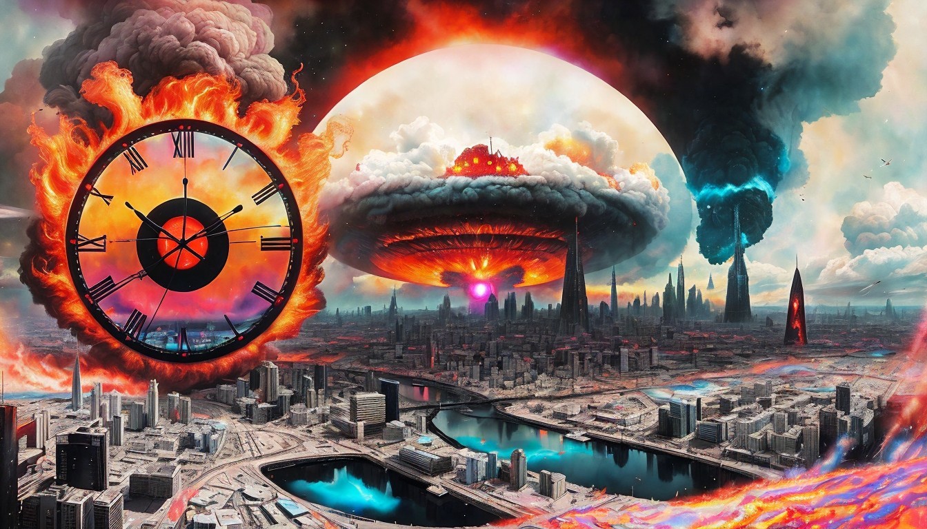 Prompt: Modern city floating in space, lava river. A giant firey clock in foreground, Black hole in the sky, psychedelic cloud colors, Comics style mixed with dystopian miniature work. Mixed media By Beksinski and Bill Sienkiewicz.