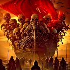 A dramatic scene depicts fierce pirate ships sailing through tumultuous waves, with a fiery skull emerging from dark clouds, creating an atmosphere of chaos and adventure.