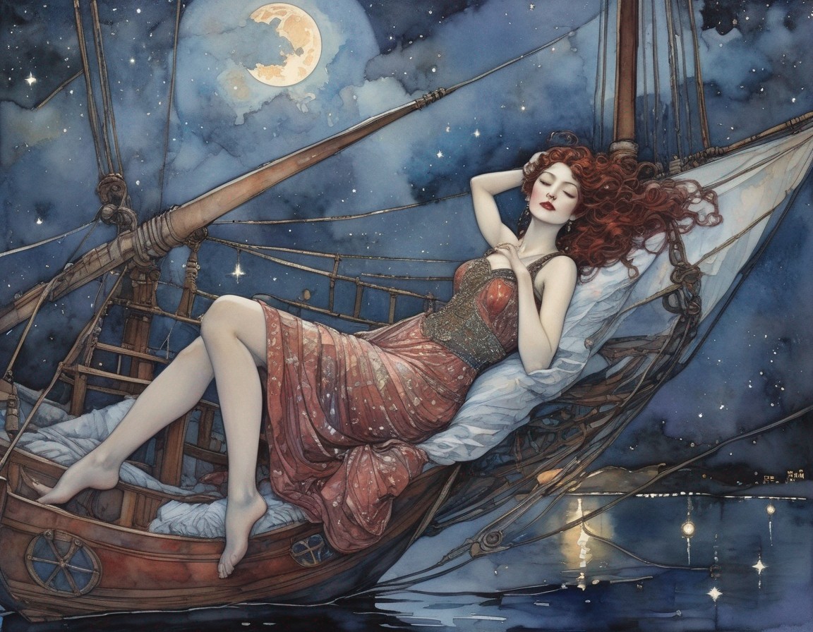 + Prompt:A stunning enchantress, adorned in an exquisite sailing vessel, engrossed in the examination of stars and constellations under the gentle glow of a crescent moonlight.