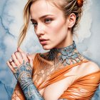 A striking woman with intricate tattoos covering her arms and neckline poses gracefully. She wears a soft, flowing dress and has floral accents in her wavy hair, set against a dreamy cloud backdrop.