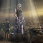 A waving long blond hair athletic woman in a sleek black and silver mini dress stands confidently in a barren landscape, flanked by Doberman dogs. The dogs intricate as highly trained and protection dogs, Soft beams of light illuminate the scene, creating a dramatic atmosphere against the dusky sky. The background features muted earth tones, enhancing the surreal, grim dark steampunk fantasy, spiritual scene and futuristic vibe of the image. Photo realistic 4K