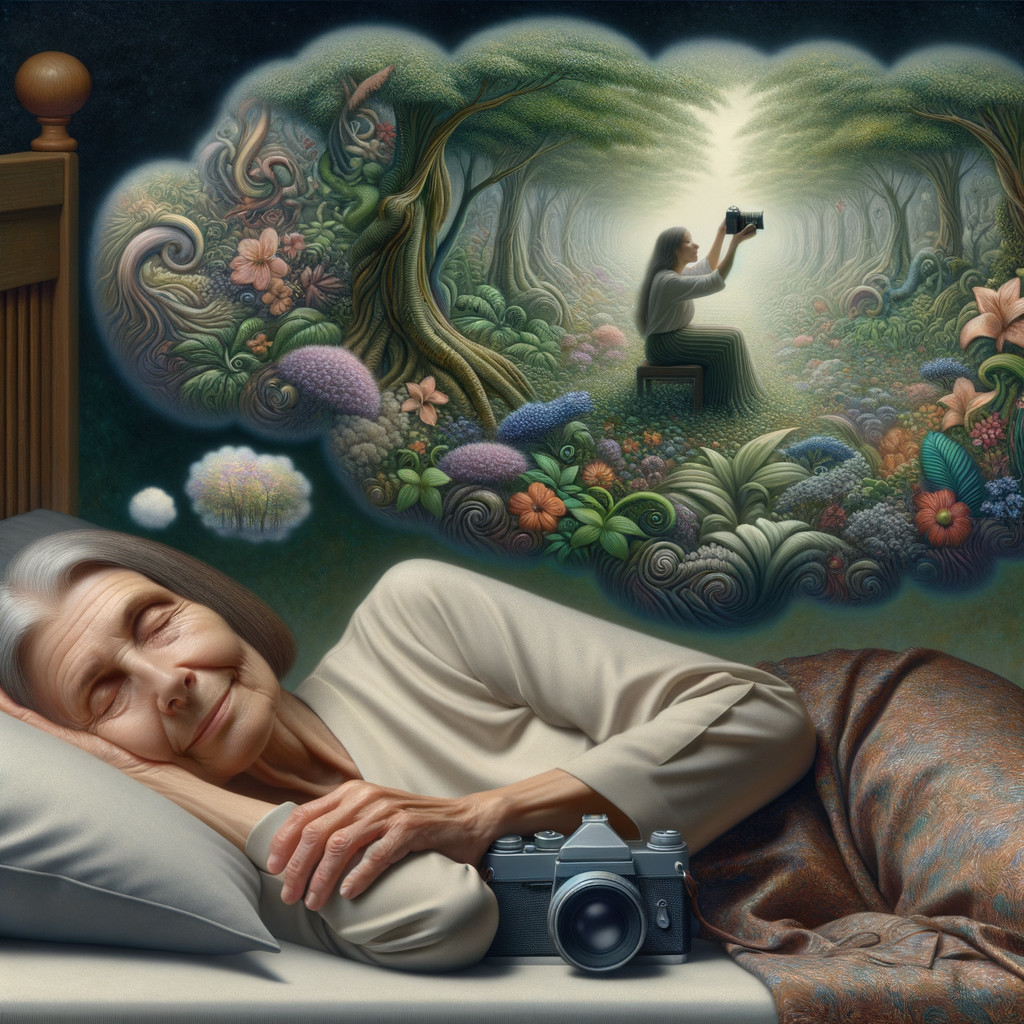A serene image of a woman dreaming of a magical forest filled with vibrant flowers and a glowing butterfly, symbolizing peaceful imagination or memory.