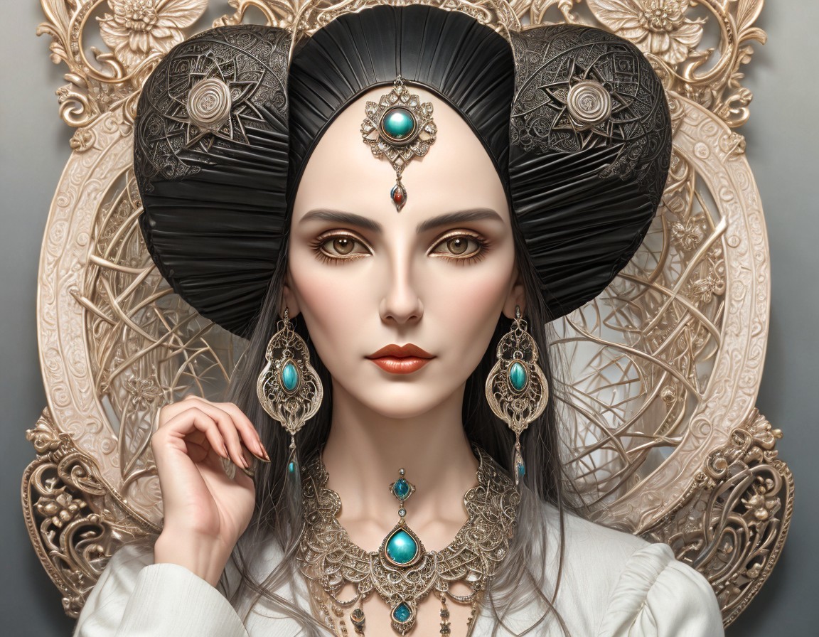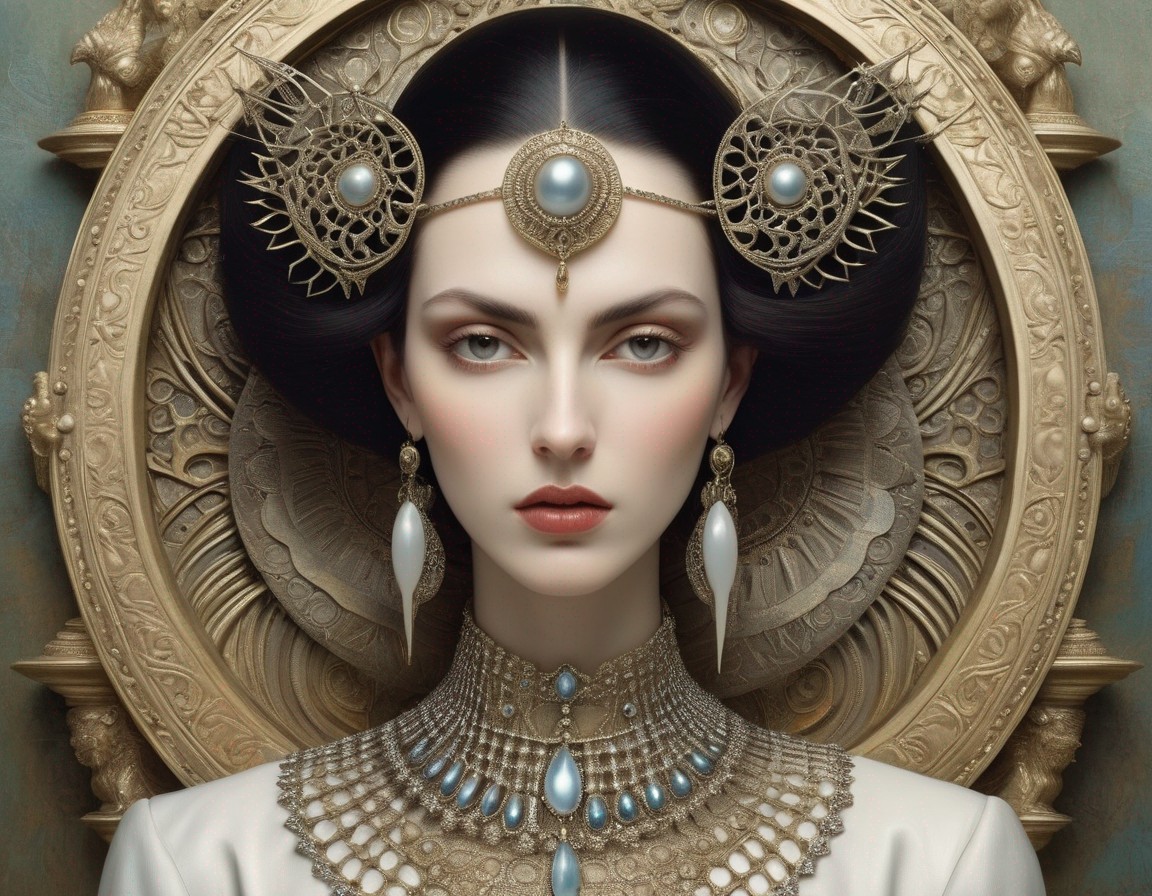 A portrait of a woman with elaborate hairstyle, adorned with gold accessories, against a decorative circular backdrop.