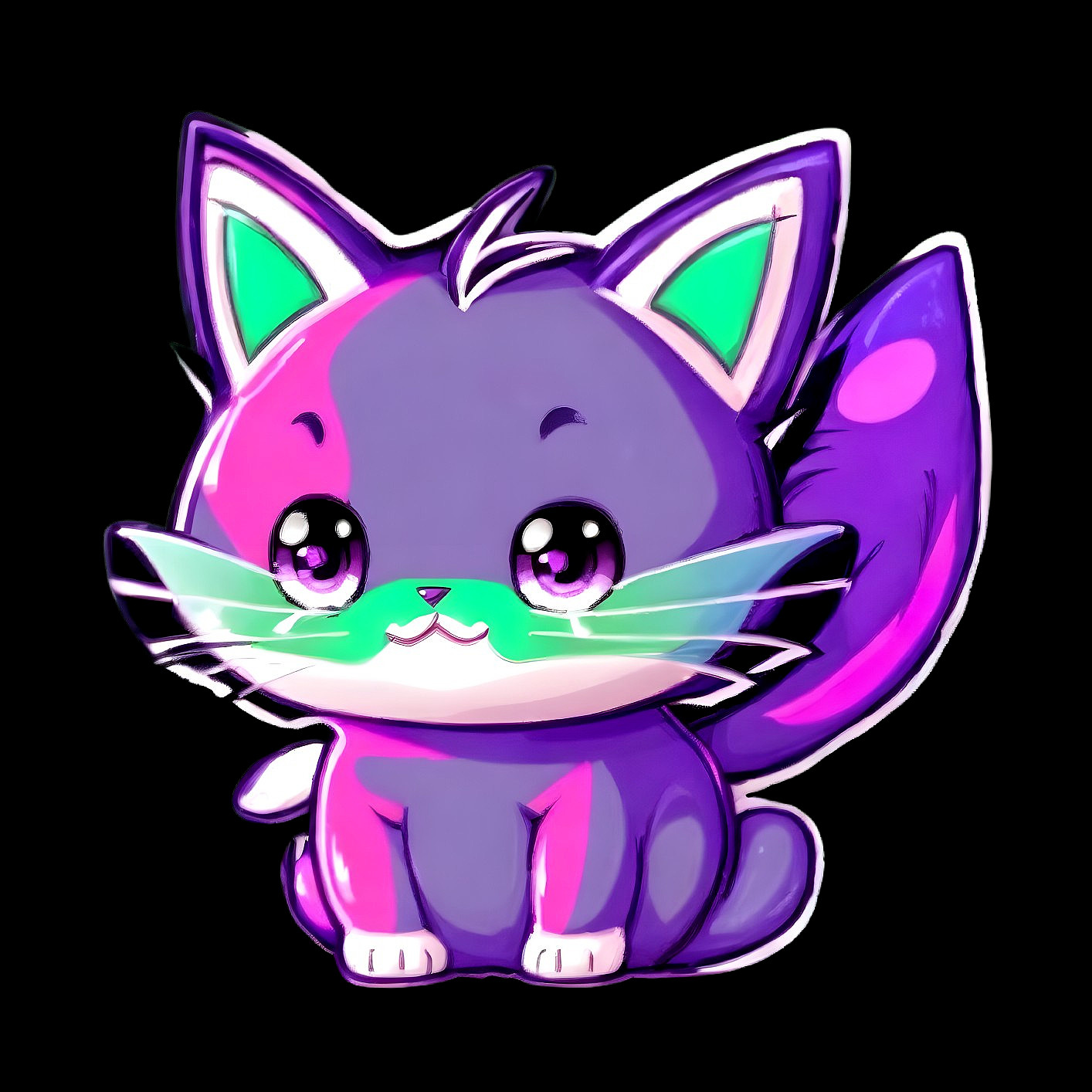 Create a kawaii purple-green-cat in a Pokémon-inspired style, vibrant colors, and anime aesthetic. The artwork should be cartoon sticker-like with clear lines on a white background. Include "DEEP DREAM GENERATOR" in playful lettering. Aim for Pixar quality suitable for video games, detailed, vibrant, whimsical, and enchanting.