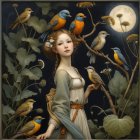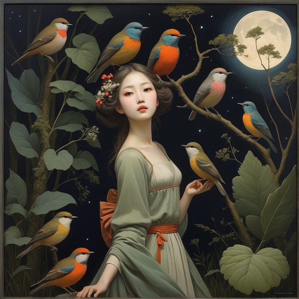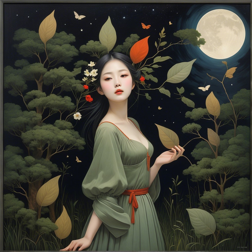 A serene woman in a flowing green dress stands in a lush forest at night, illuminated by a full moon. She gazes thoughtfully, with leaves gently falling around her.