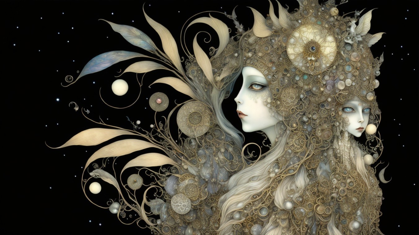 The image features a beautifully detailed woman's face merging with a fantastical castle and intricate foliage, blending elements of architecture and nature in an ethereal composition.