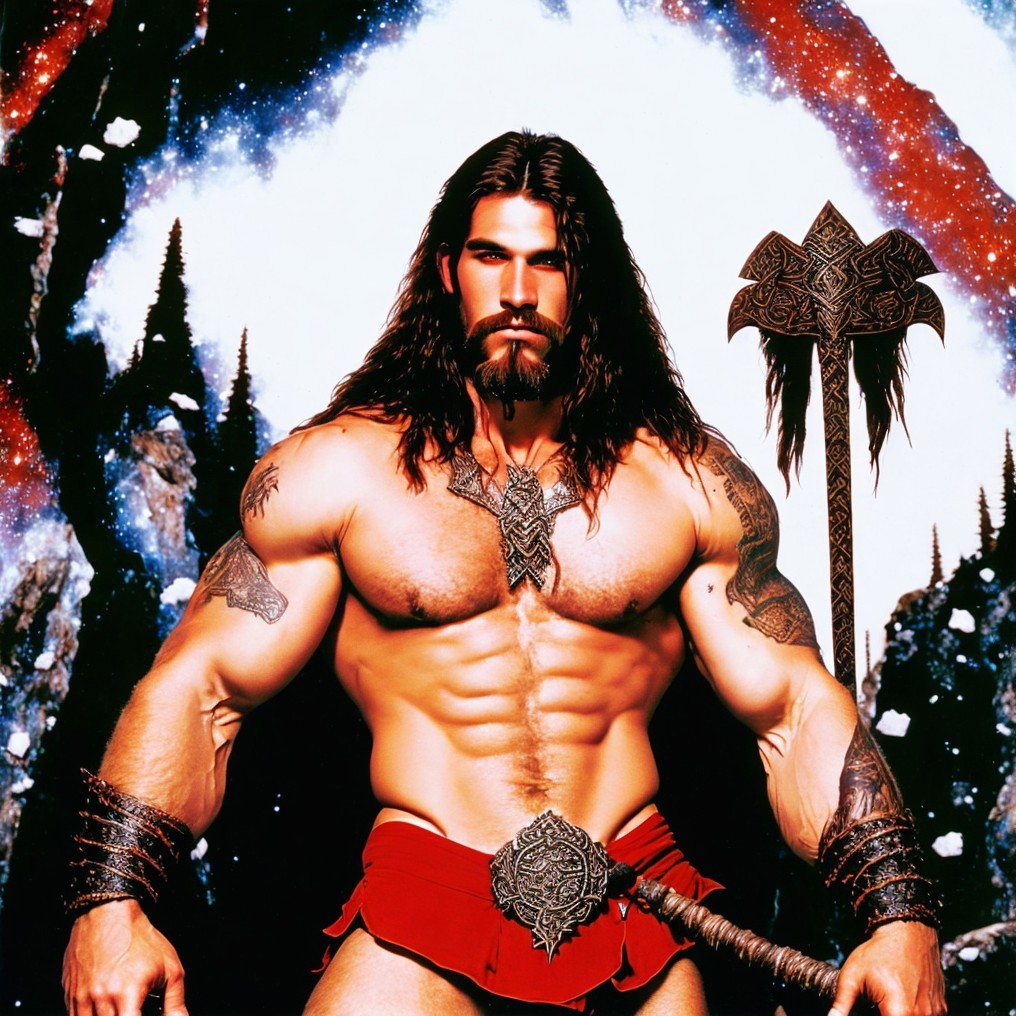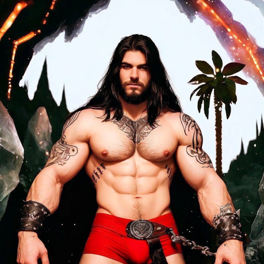 A muscular warrior stands confidently, adorned with tribal tattoos and a fierce expression. He holds a staff and wears minimal armor, set against a dramatic backdrop of flowing water and dark rocks.