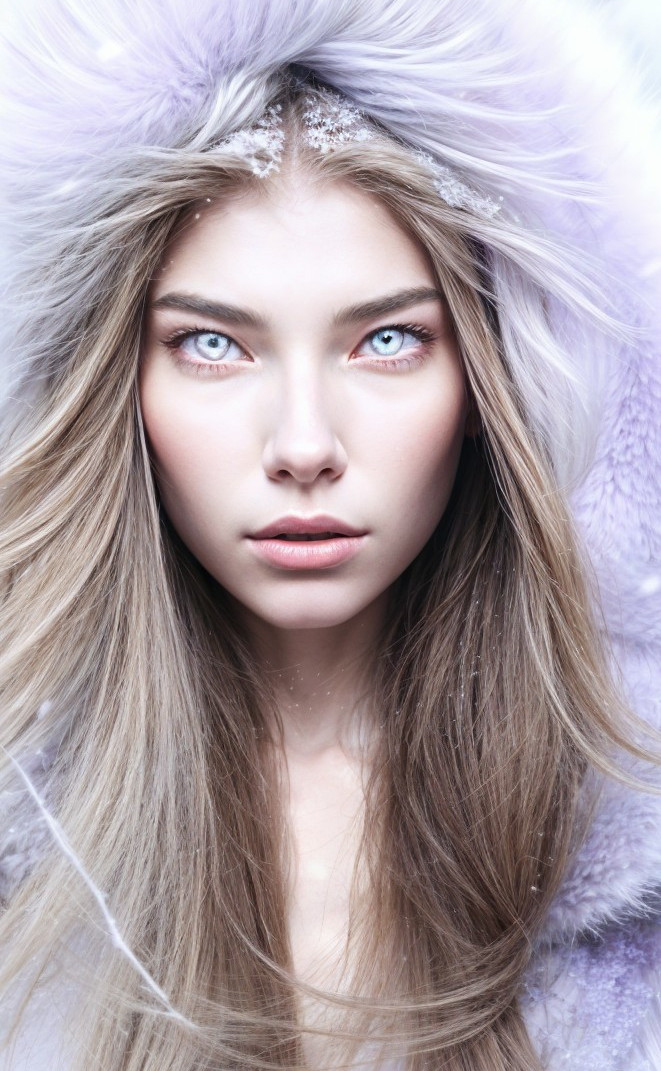A close-up portrait of a young woman with long, flowing hair, wearing a fluffy, light-colored hood. She has striking, pale eyes and a serene expression, set against a soft, snowy background.