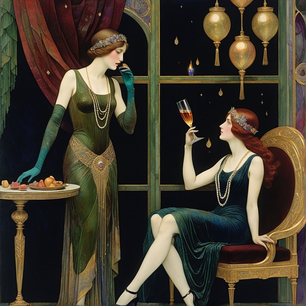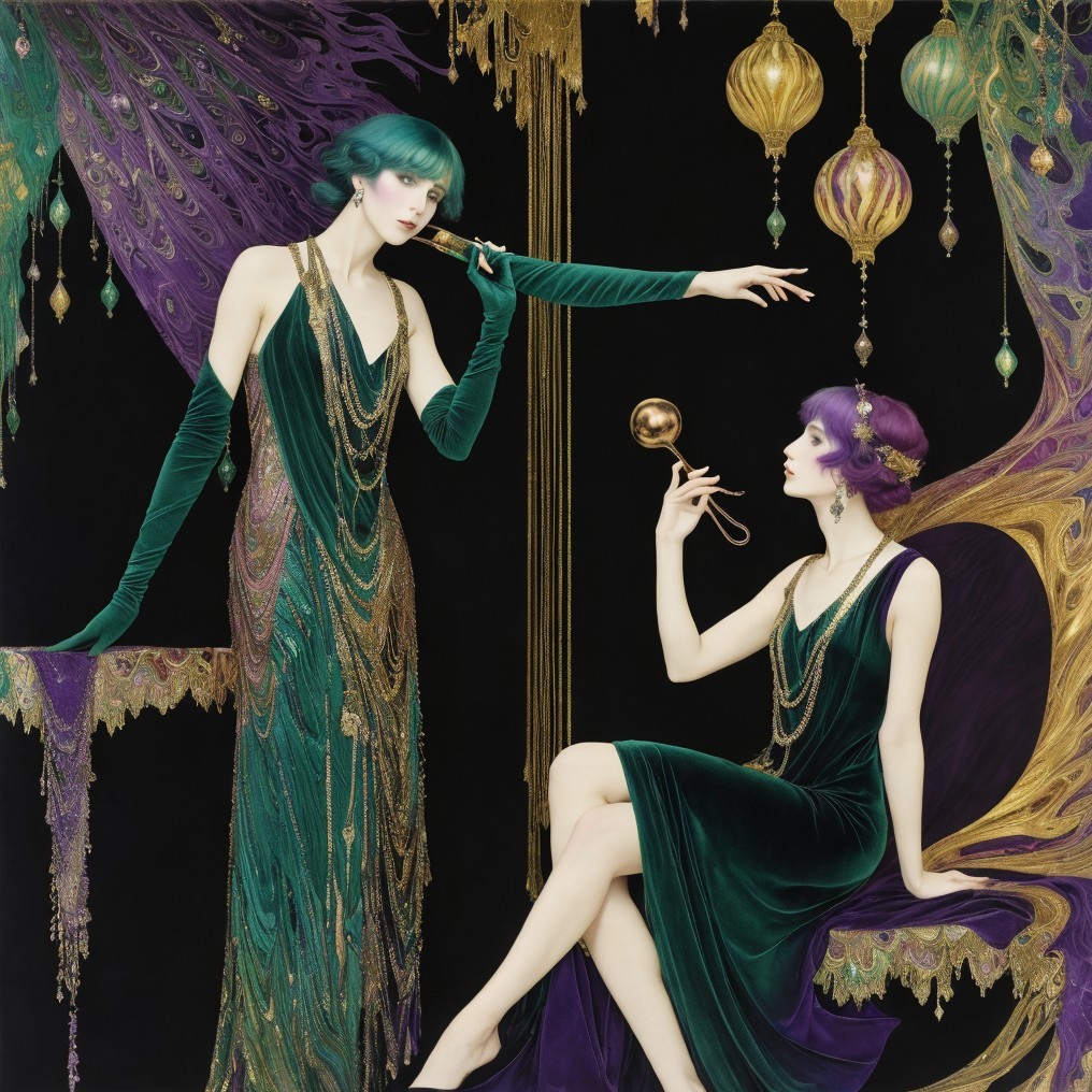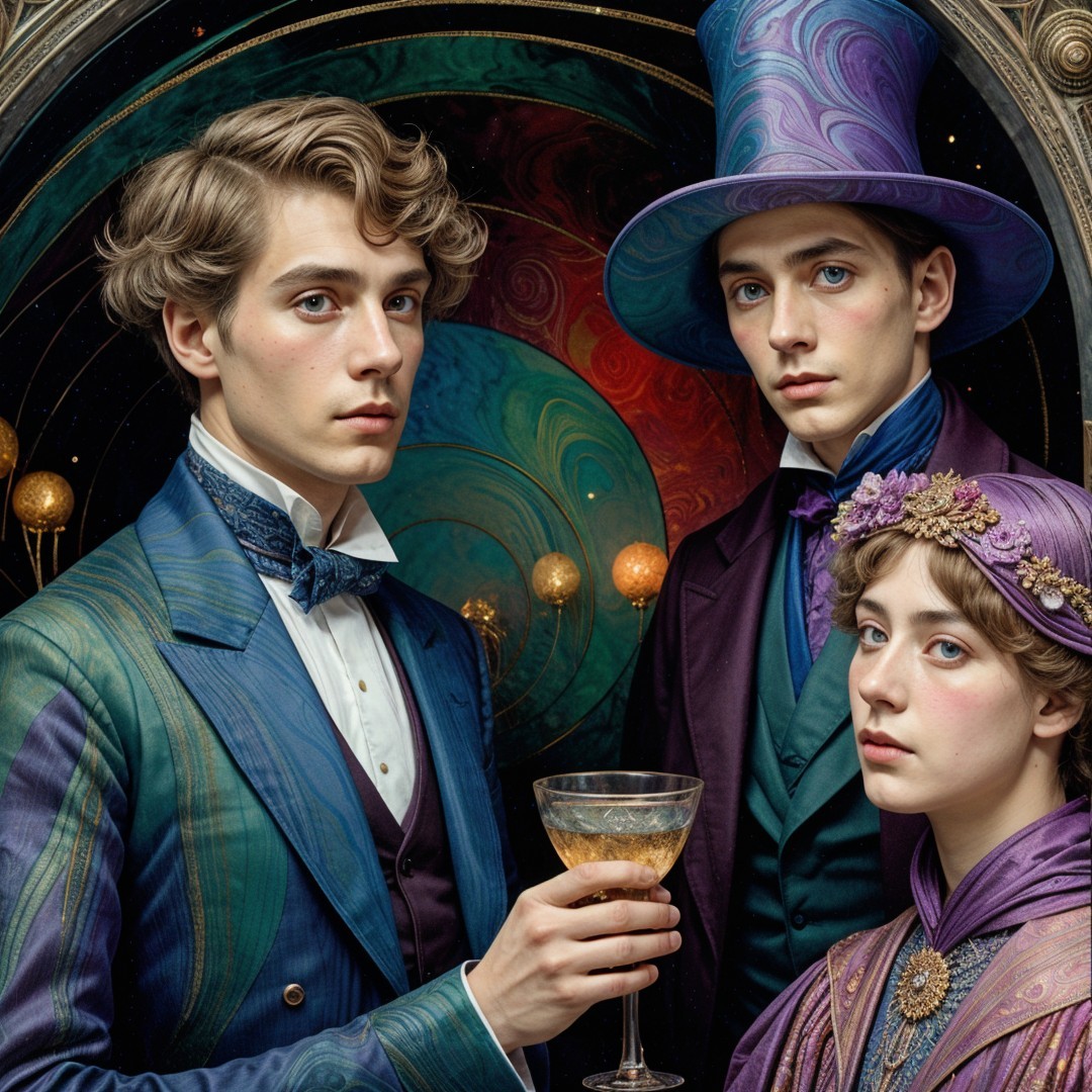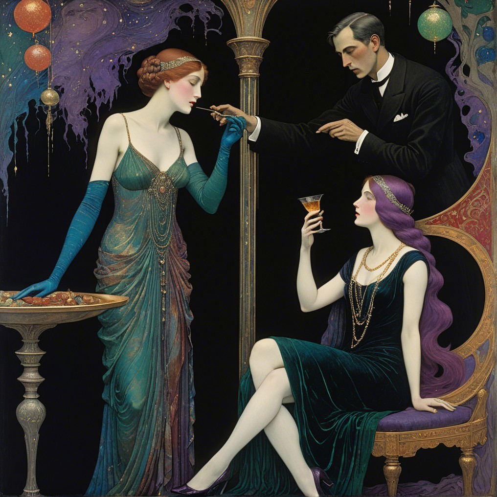 The image features a man flanked by two elegantly dressed women, each in richly colored gowns with intricate hairstyles and accessories, set against an ornate, vibrant background.