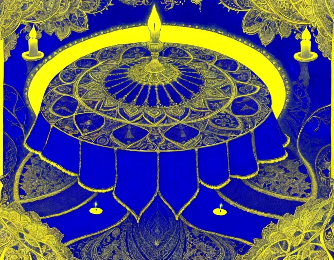 Prompt: "Intriguing New Delhi Doodles", "The Séance". A dark room illuminated in pale yellow by a single candle in the center of the Table. Optical illusion, Zentangle method line art, unreal but finely detailed indigo ink line drawing. Surreal, Mystic, Ethereal and Intricate."