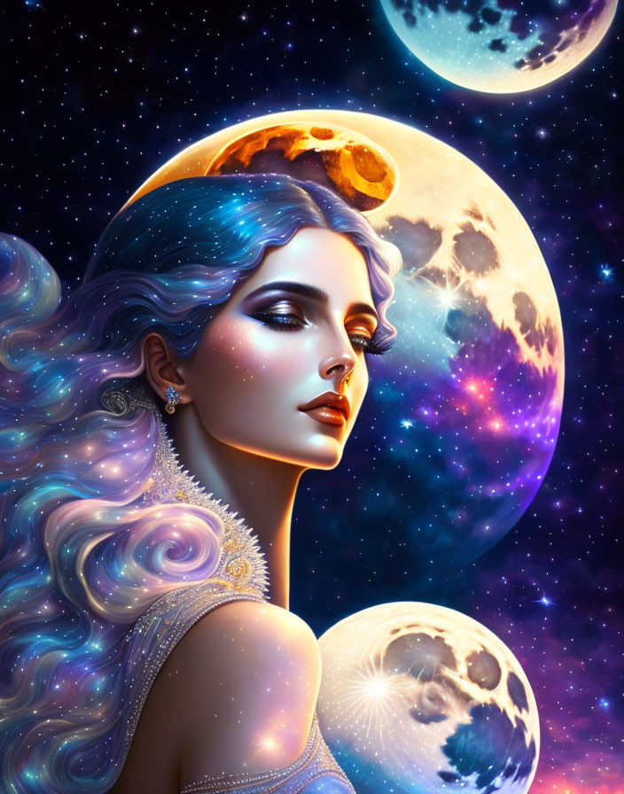 Illustrated woman with golden tiara and earrings against moonlit backdrop