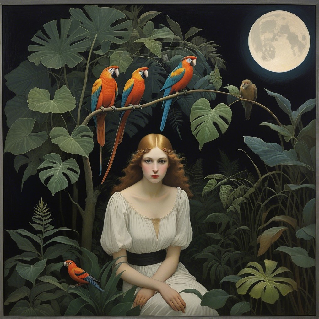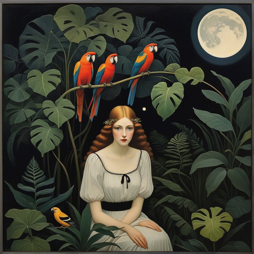 A young woman in a white dress sits among lush green foliage, illuminated by a full moon. Her red hair frames a serene face adorned with flowers, evoking a sense of tranquility and mystery.