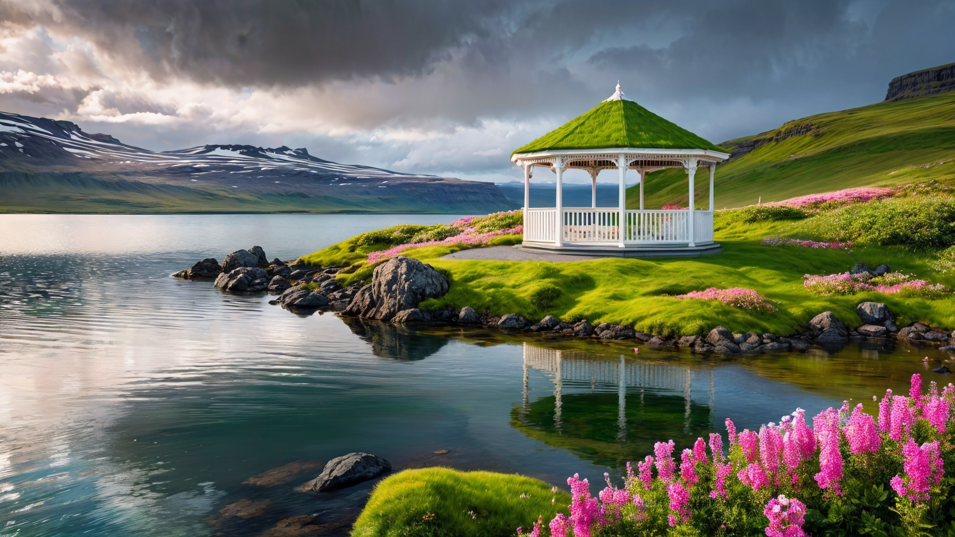 (Try from Anastacia ) - A stunning gazebo of light grey wood with a green roof sits on a rocky island surrounded by a lake. Pink and white wildflowers bloom vibrantly after rain, creating a picturesque, serene scene.