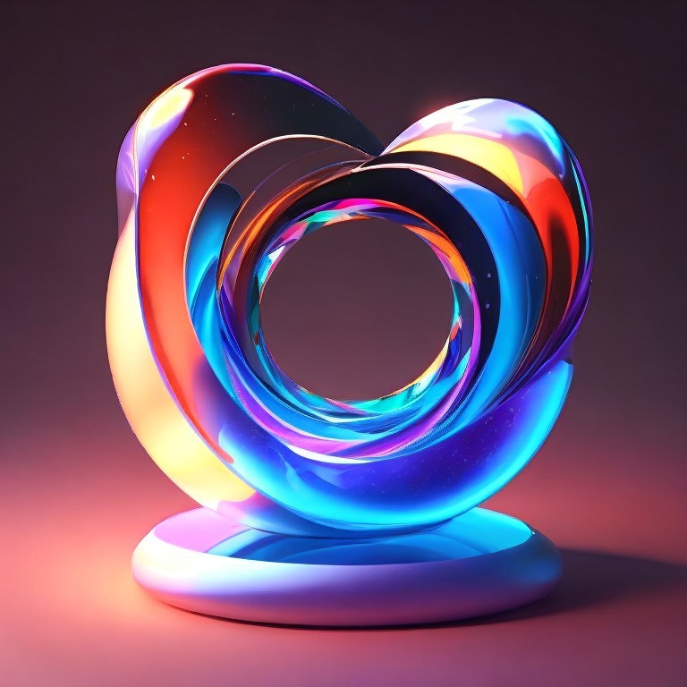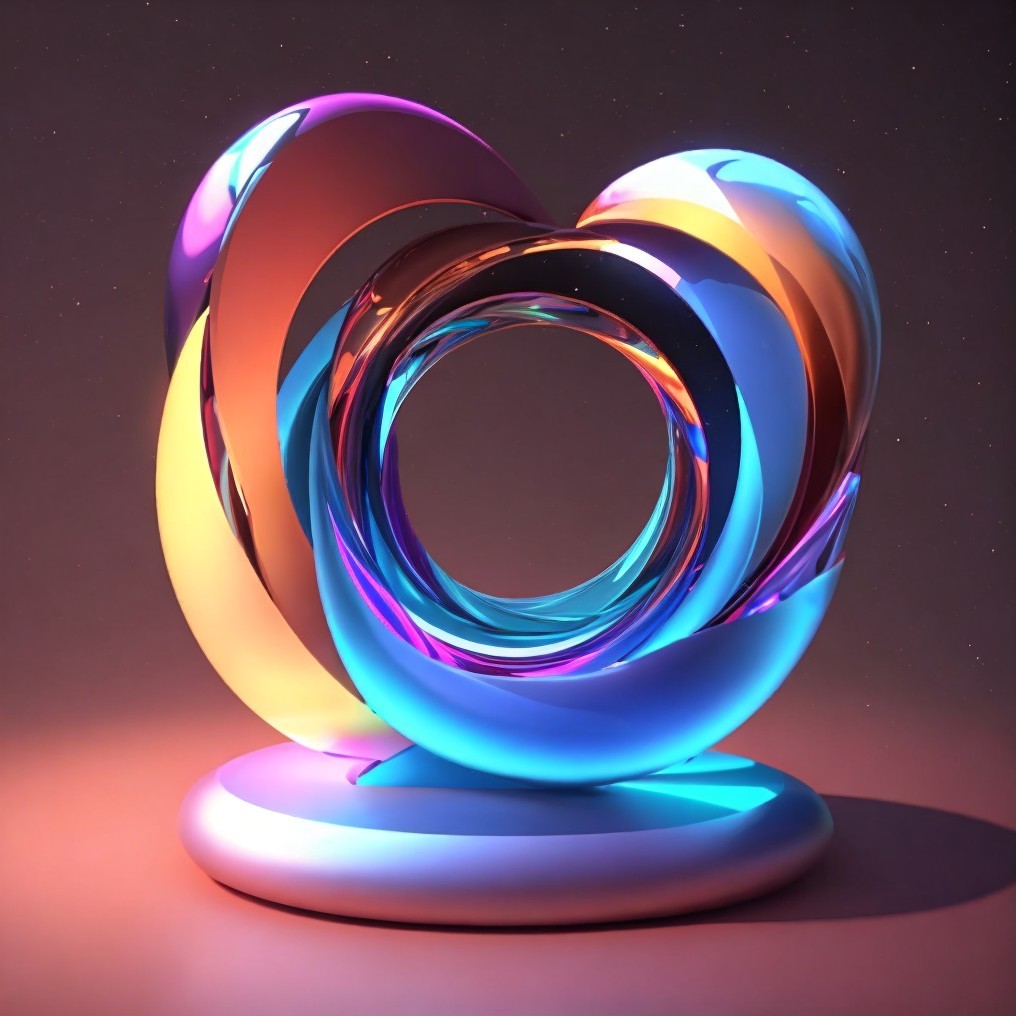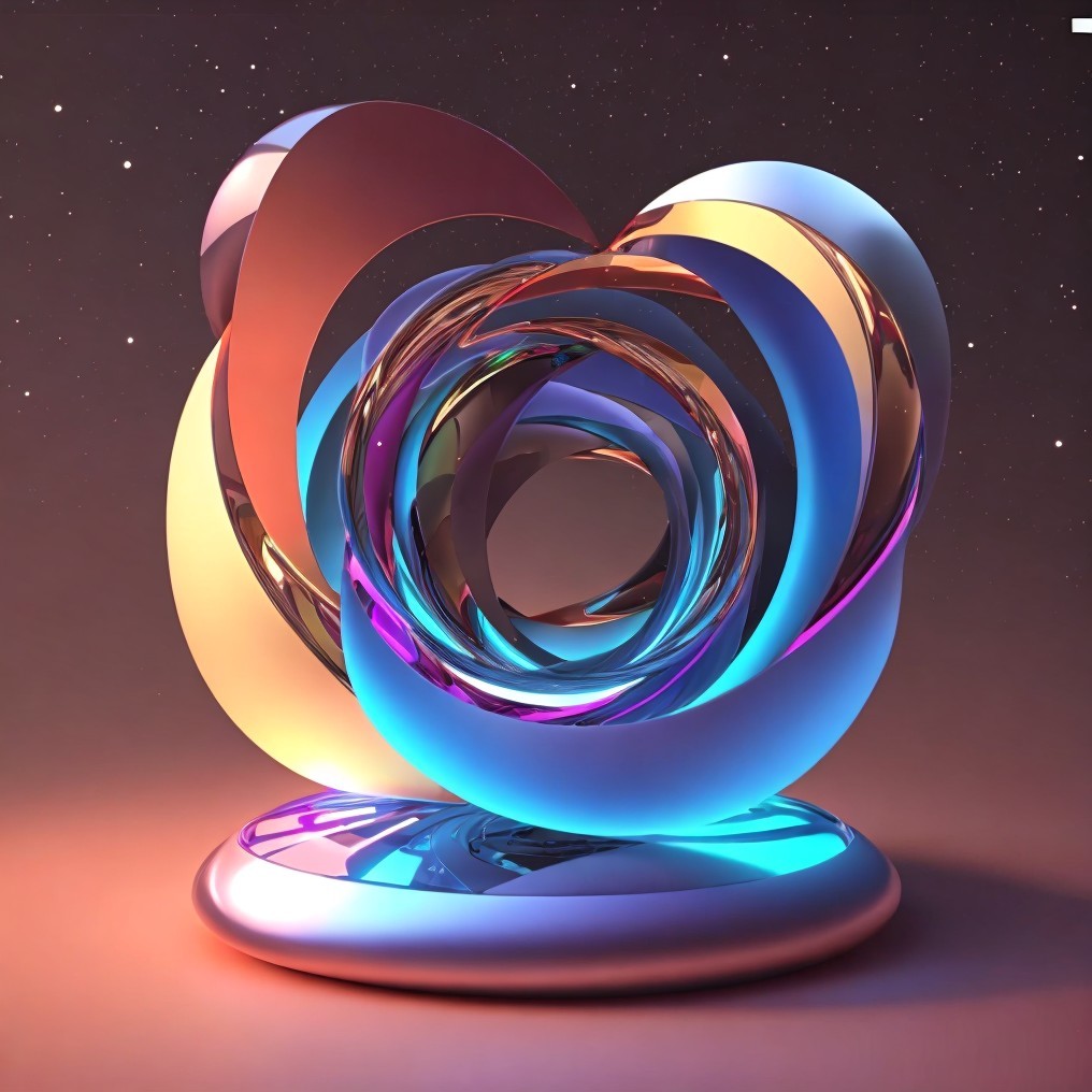 A 3D render of an abstract, illuminated spiral sculpture with gradient colors on a circular base, against a muted background.
