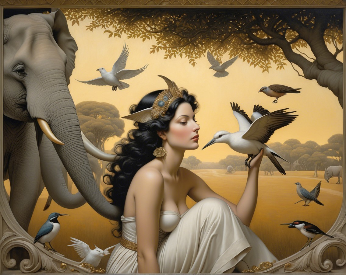 A serene scene featuring a woman in a flowing white dress gently interacting with a white horse. Surrounded by lush greenery, tigers, birds, and a butterfly, it embodies beauty and harmony.
