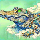 A vibrant, stylized alligator rests in lush foliage by a serene waterway, with whimsical castles in the background and a bright sky filled with fluffy clouds. The colors are bold and lively.