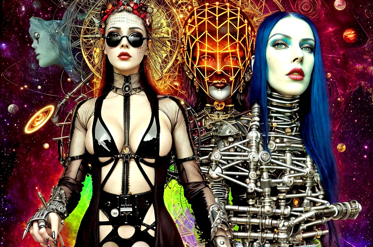 Digital Artwork of Cybernetic Women in Cosmic Scene