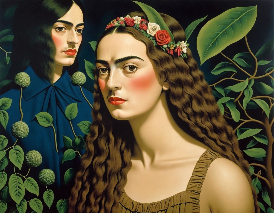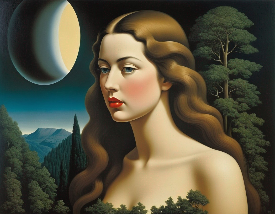 A surreal painting of a woman's face blending with a forest path leading to a bright light.