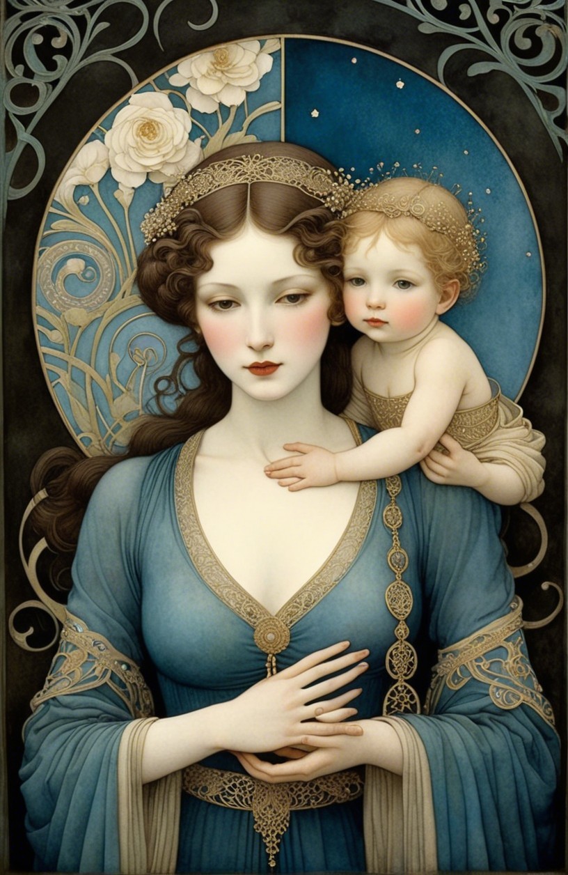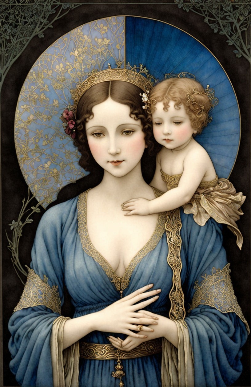 A serene woman in a flowing blue gown cradles a white bird, while a cherubic child clings lovingly to her shoulder. The background features floral designs and a starlit sky, conveying harmony.