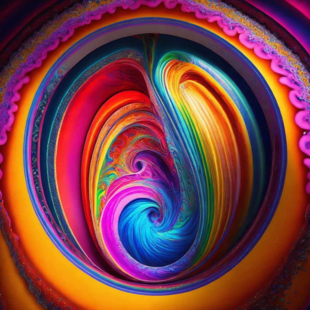 A vibrant, multicolored fractal swirl with intricate patterns glowing against a dark background, resembling a psychedelic spiral galaxy.