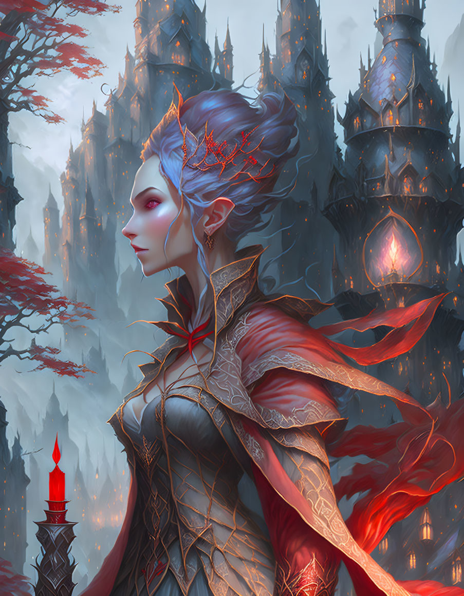 Prompt: elegant elven mage with red updo casting spells and practicing magic, by astri-lohne and lenabwolf, insanely detailed city of magic in background by jordan grimmer