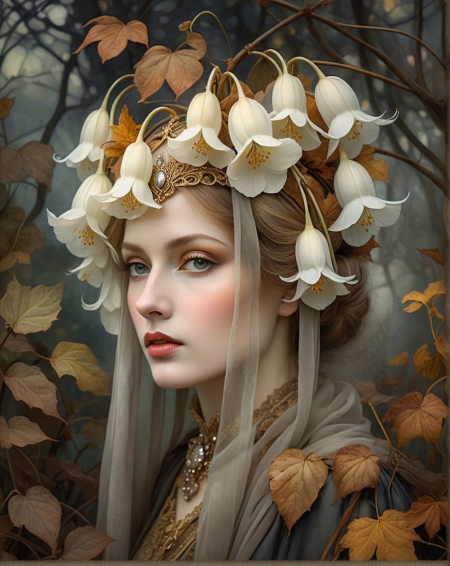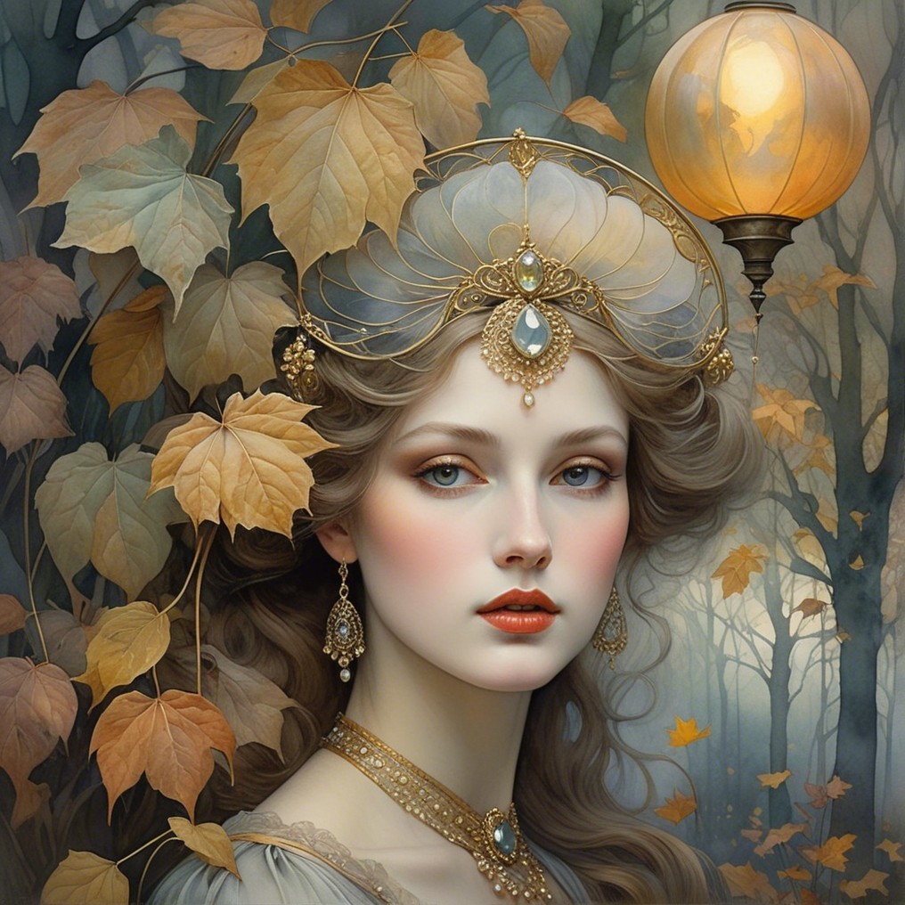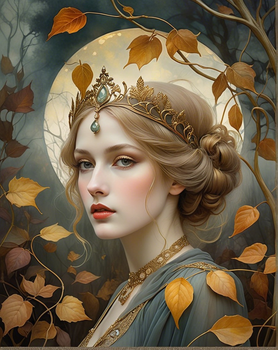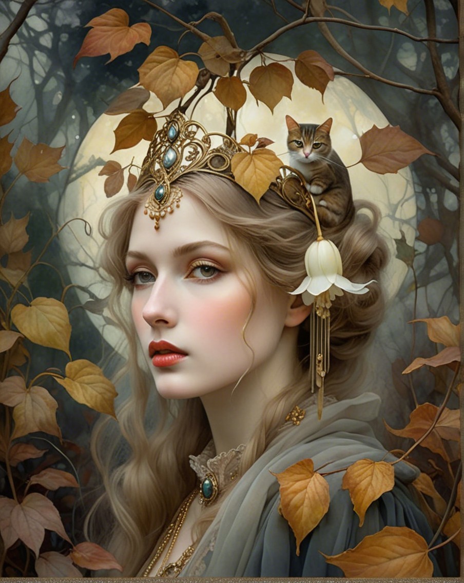 The image features a young woman in a dark gown, adorned with elegant jewelry, holding a cat. Behind her, a dreamy autumn landscape with golden leaves and a soft glow creates a mystical atmosphere.
