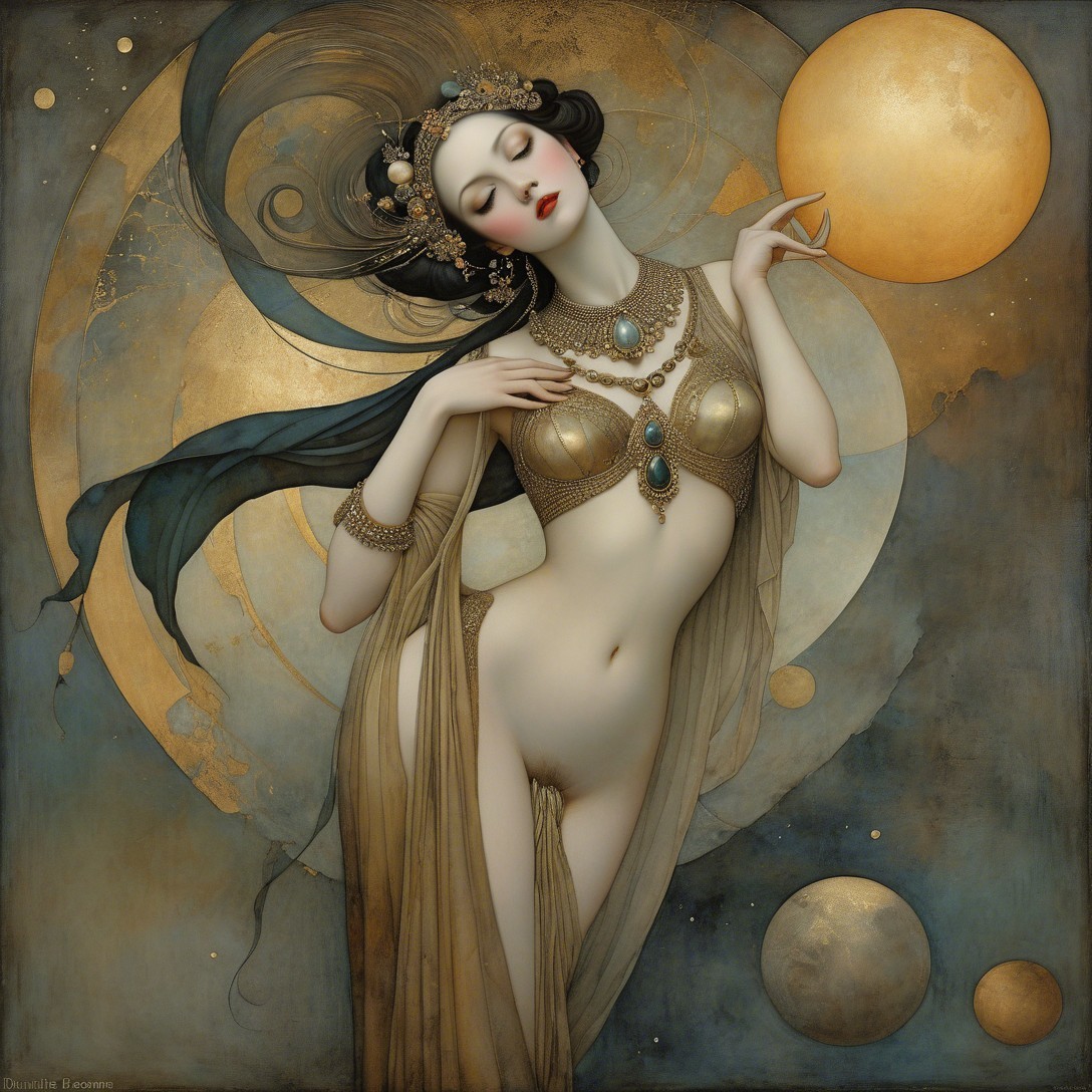 A beautifully rendered digital painting in the style of fantasy art shows a woman in a blue hat against a dream-like landscape at twilight. The woman has an oval face with pale skin and rosy cheeks, and she looks directly at the viewer with light blue eyes. Her dark brown hair is tucked under a
