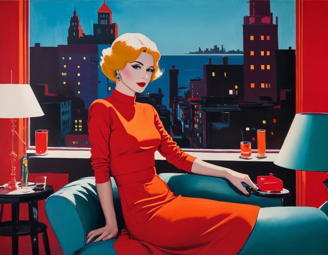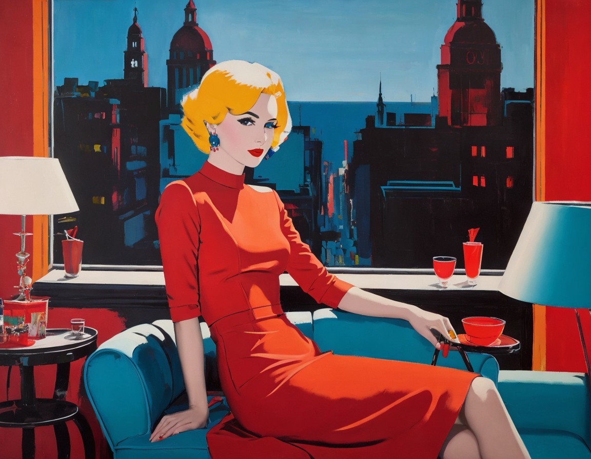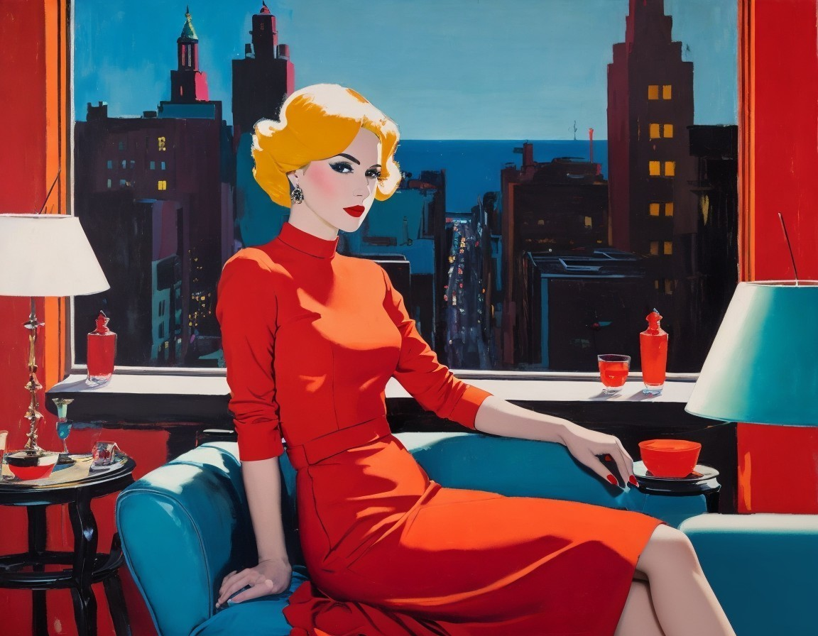 An illustration of a woman with blonde hair in a red dress sitting elegantly on a blue sofa with a cityscape background.