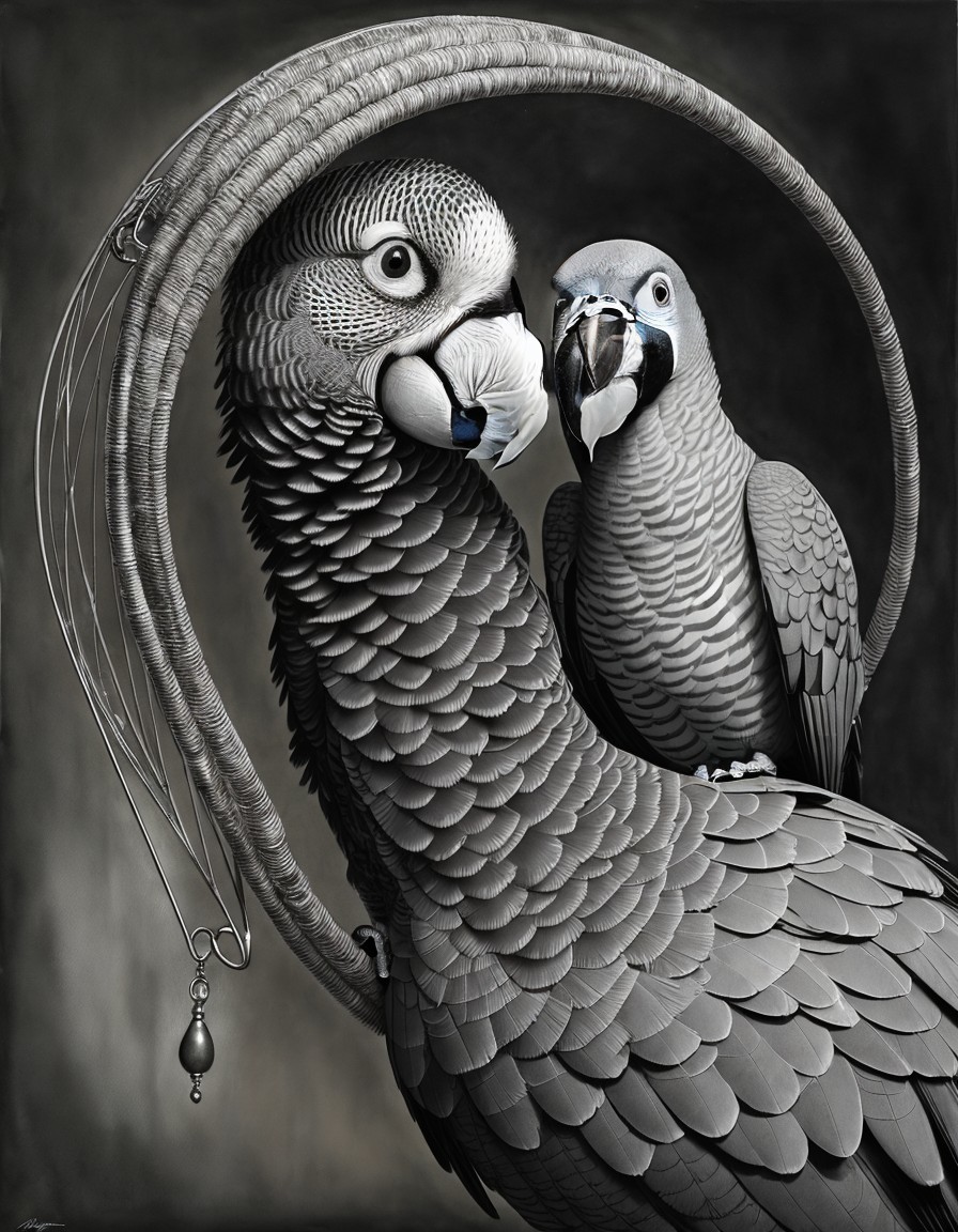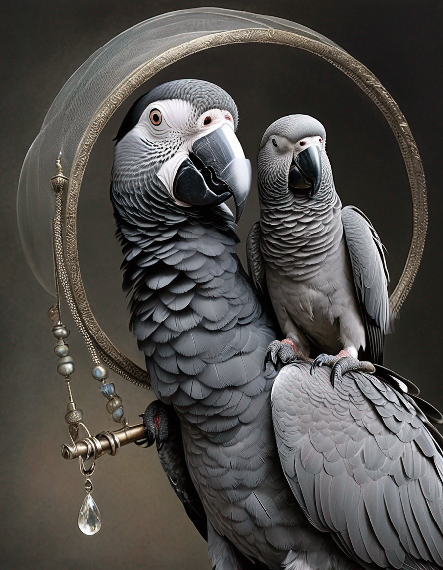 An African grey parrot wearing a stylish hat adorned with feathers and an earring, posing majestically against a brown background.