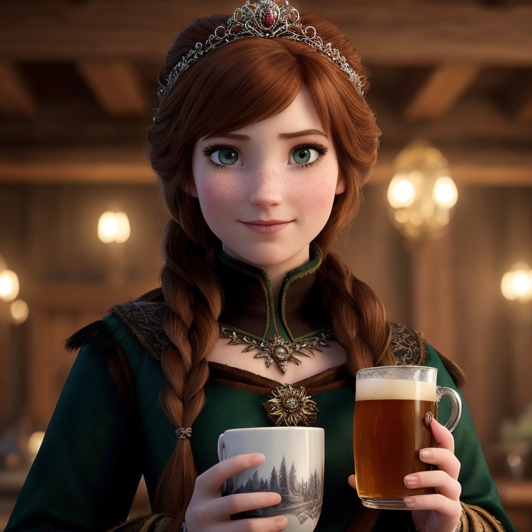 Princess Anna from the movie Frozen holds up a mug of ale, elegant tavern, old Norse aesthetic.