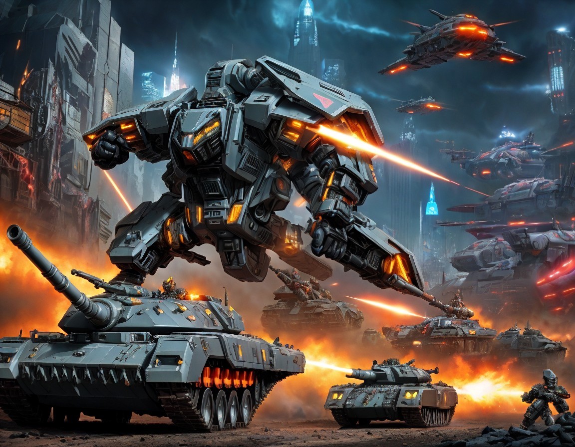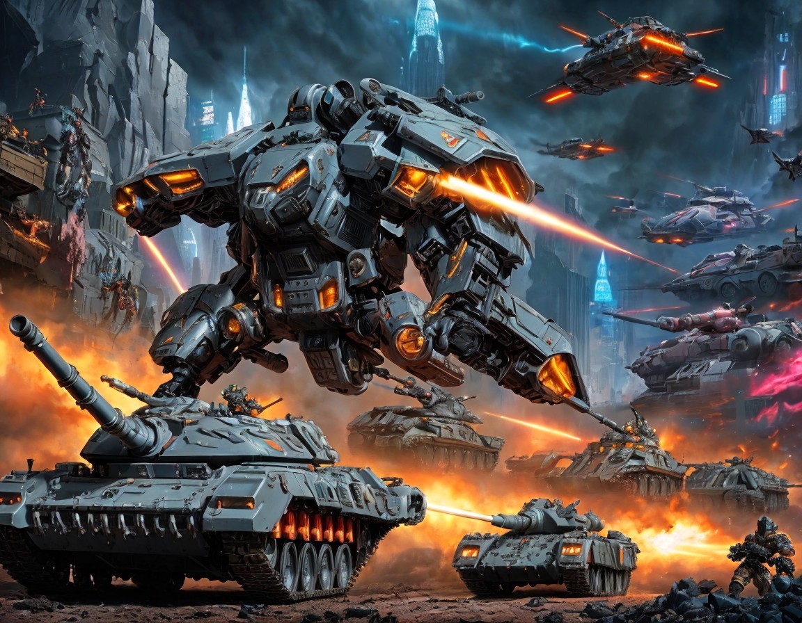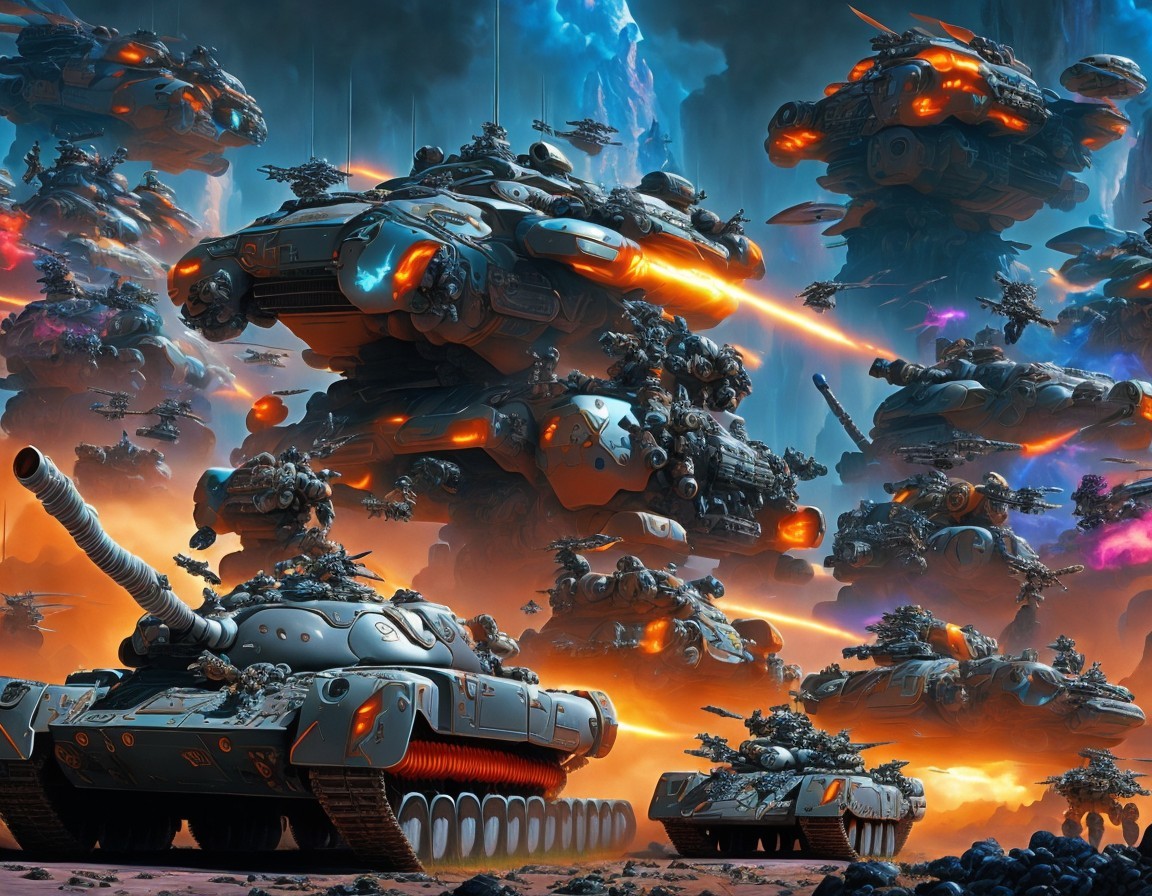 A towering robotic mech stands amidst a fiery landscape, flanked by tanks. Eerie mountains loom in the background, illuminated by vibrant colors, creating a dramatic sci-fi scene.