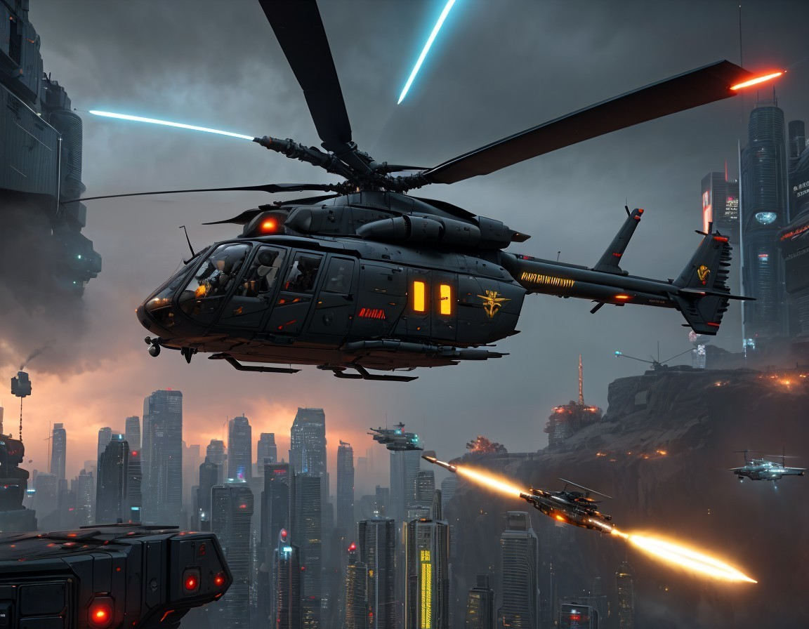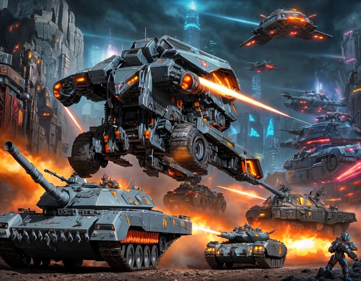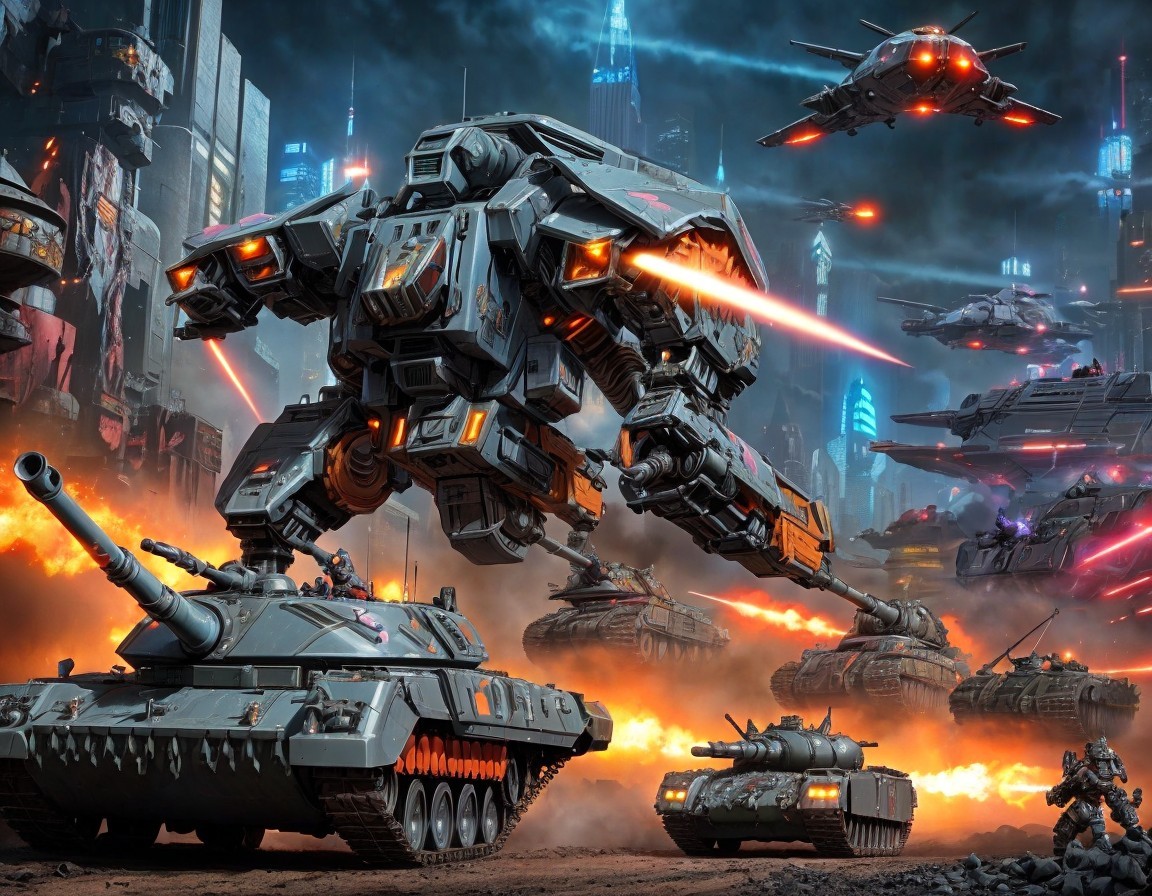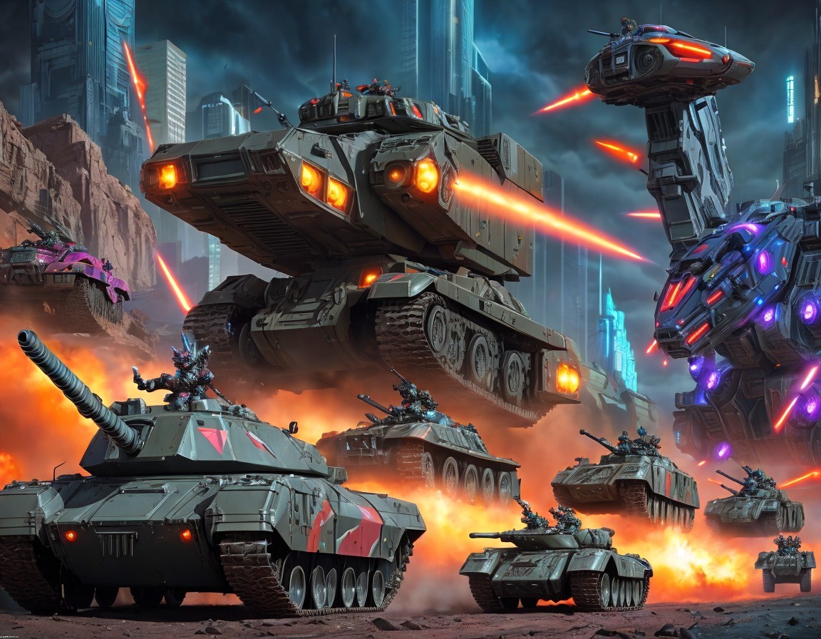 A towering robotic mech stands amidst a fiery landscape, flanked by tanks. Eerie mountains loom in the background, illuminated by vibrant colors, creating a dramatic sci-fi scene.