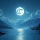 A serene night landscape features a luminous full moon reflecting on a tranquil lake, surrounded by majestic mountains and wispy clouds, creating a calm, enchanting atmosphere.